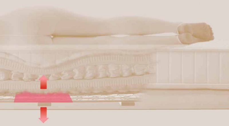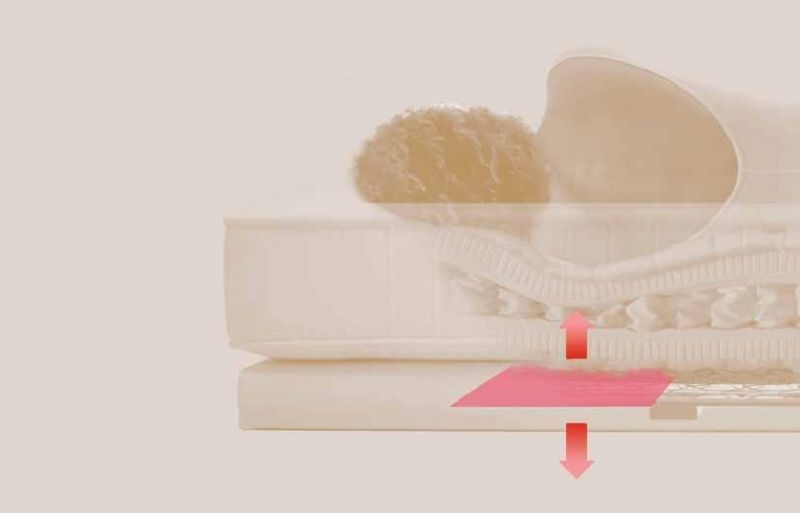Esta base absorbe a lo largo de toda su superficie, y no sólo en determinados puntos, la energía de los movimientos y grandes presiones porque reacciona a lo largo del eje horizontal y complementa así la reacción puntual del colchón de Schramm. Gracias a su efecto de superficie, proporciona al colchón de Schramm una amortiguación estable pero que sede con suavidad.
