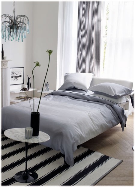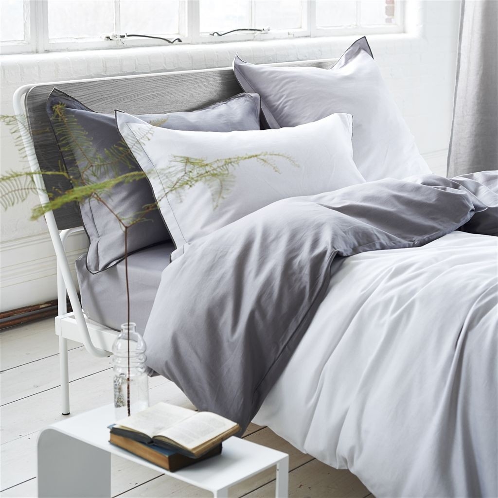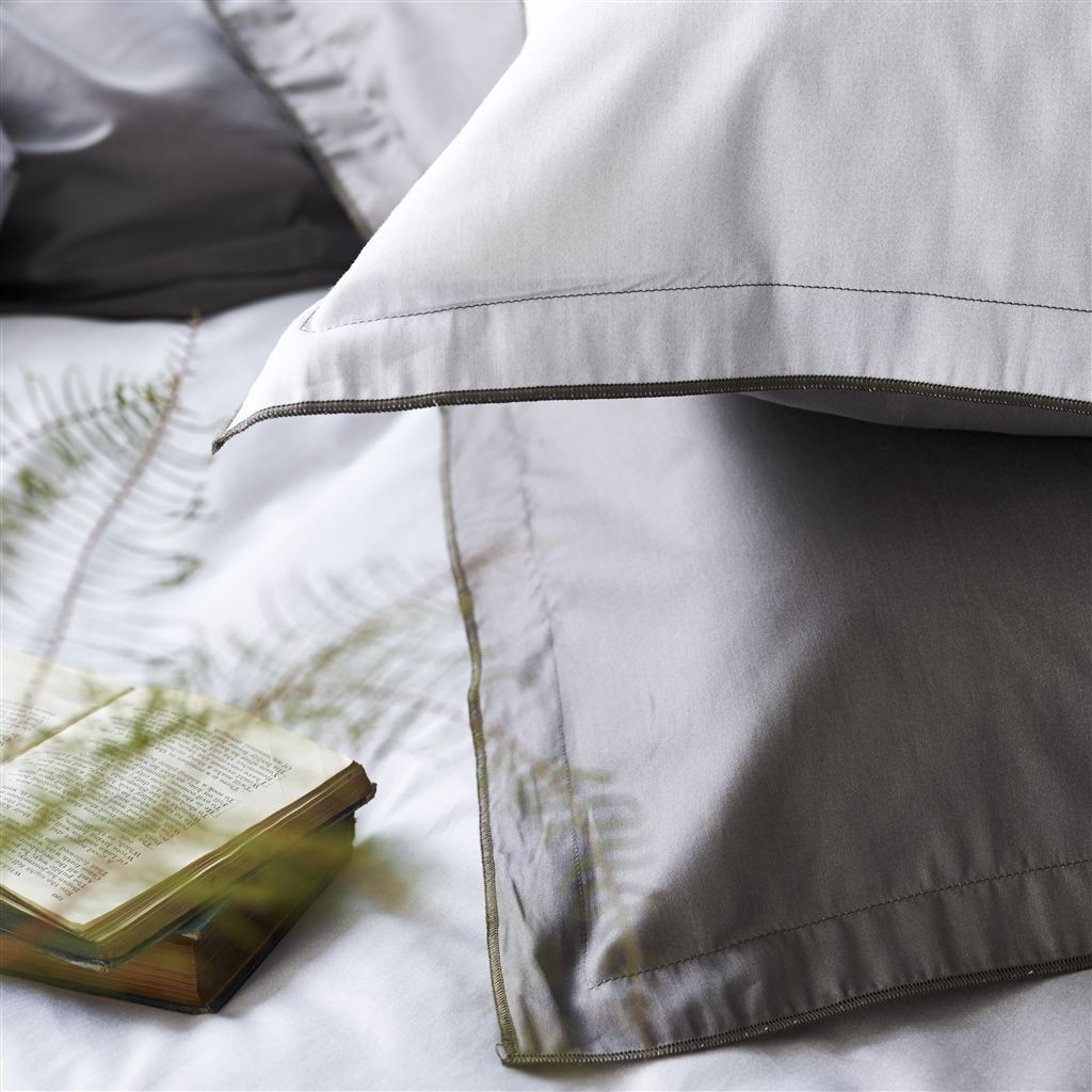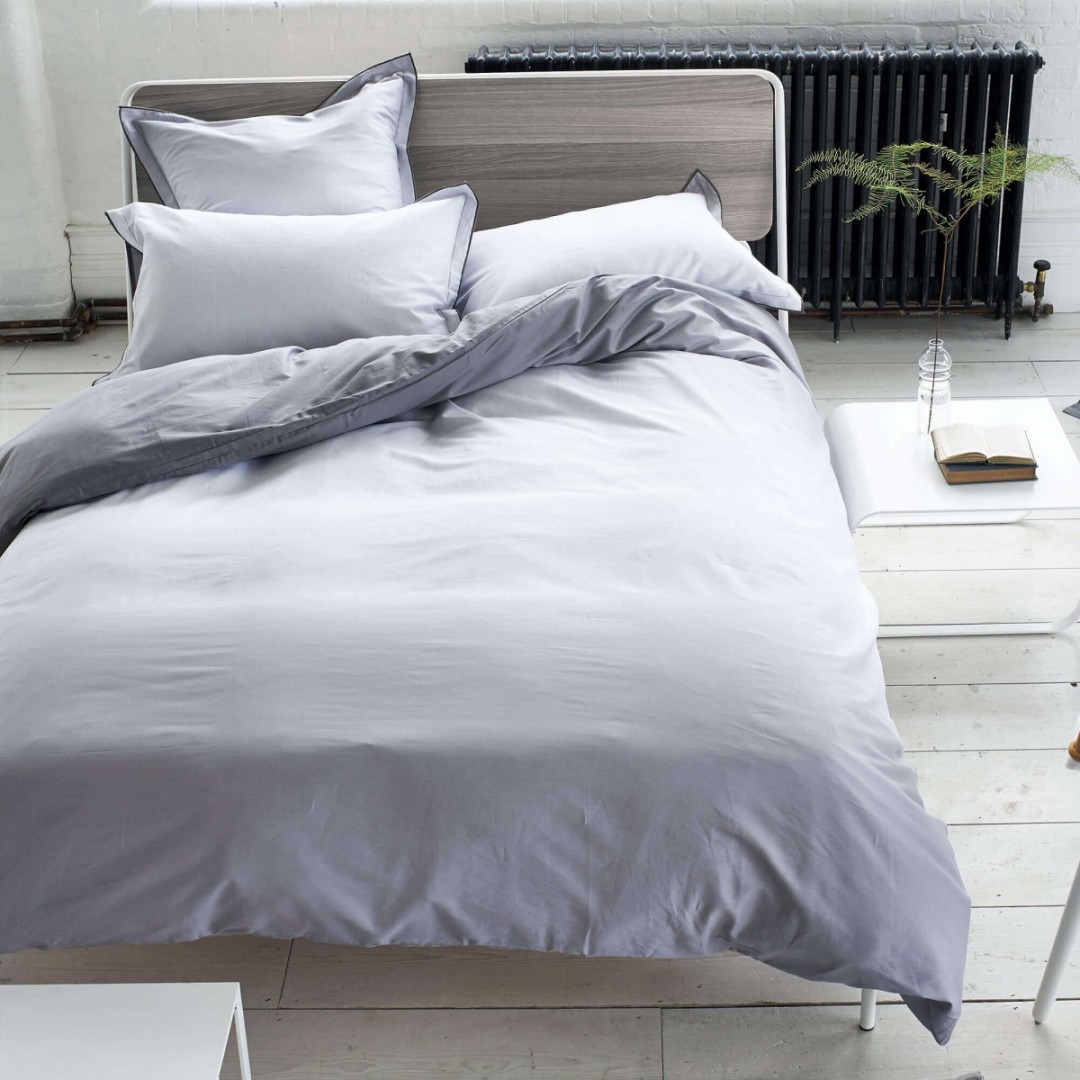 La funda de almohada SARAILLE Zinc con un perfecto degradación de colores suaves, desde el gris claro al blanco brillante, impresa en 100% algodón satinado de 200 hilos / cm2. La funda tiene un volante de 3 cm.